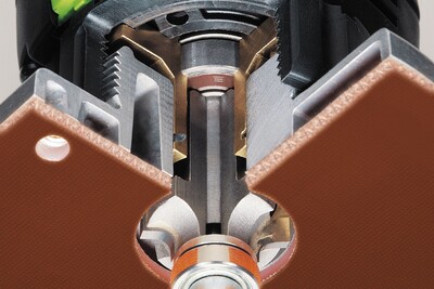 Прецизно регулиране на височината до 1/10 мм. Поставянето на фрезера директно върху шпиндела увеличава точността на въртене и осигурява чисто фрезоване. Приставката за сачмен лагер на фрезера осигурява ниска обща височина и позволява фрезоване във фалца.