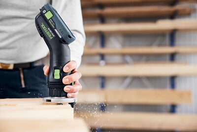 Интегрираната в центъра на тежестта акумулаторна батерия осигурява удобно фрезоване на кантовете без заплетени кабели.